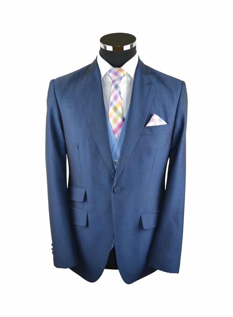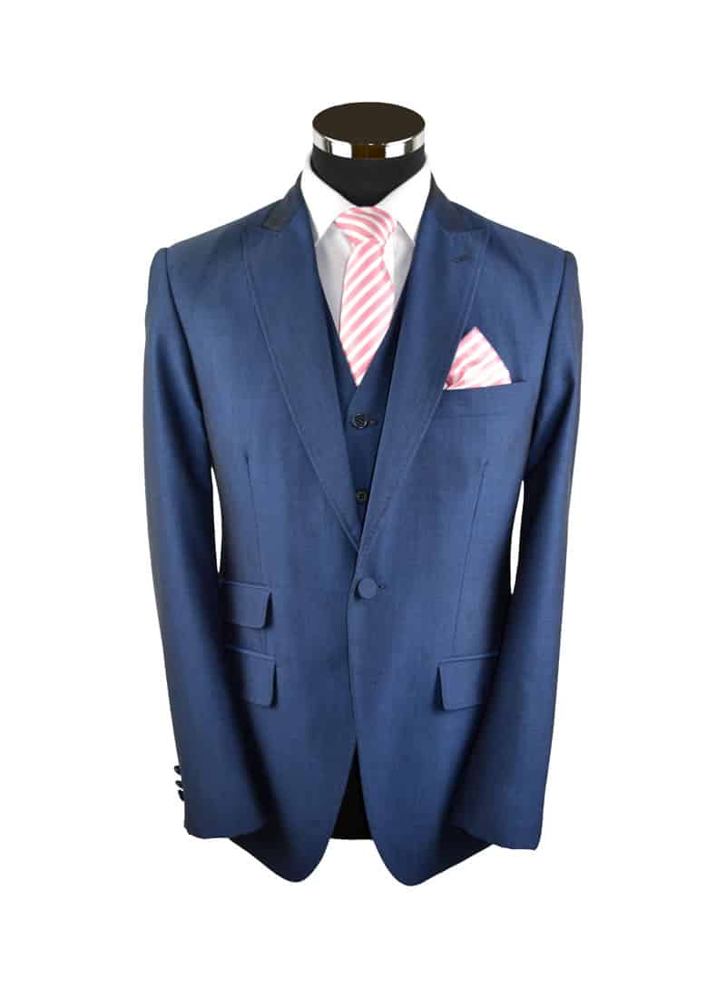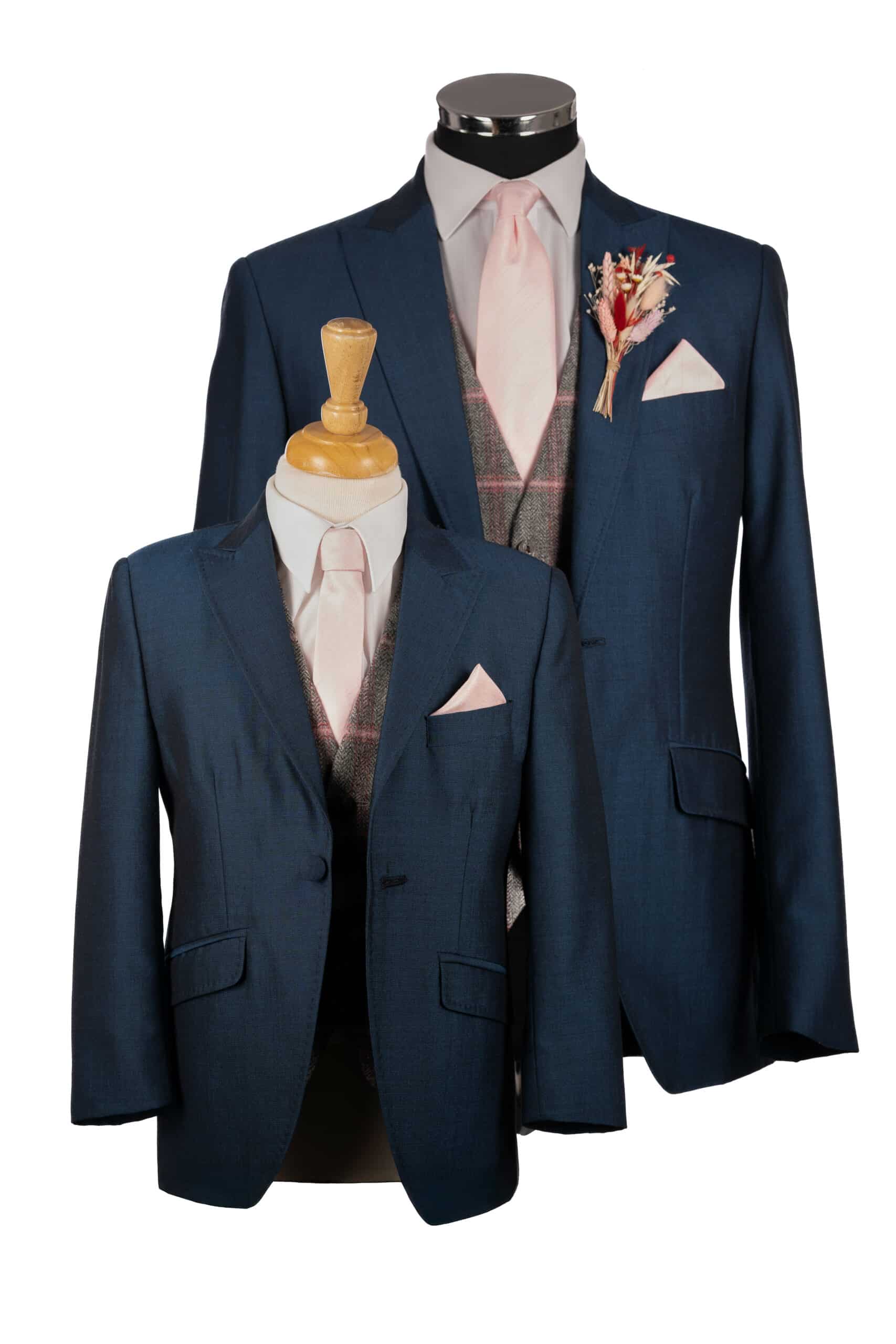 This elegant three-piece suit combines classic tailoring with a touch of modern flair, making it a standout choice for weddings. The deep blue jacket is paired with a stylish grey herringbone waistcoat featuring subtle pink checks, perfectly coordinated with a soft blush tie and pocket square. Finished with a boutonnière for added sophistication, this suit offers a refined look that’s ideal for grooms who want to balance tradition with contemporary style on their big day.